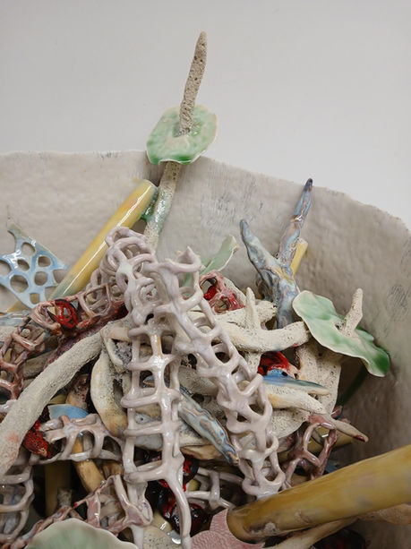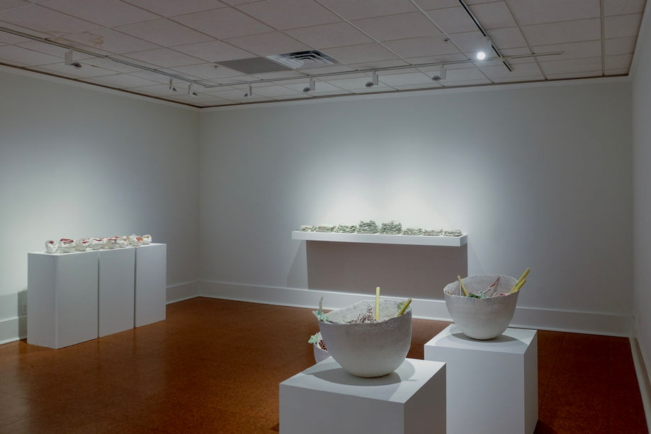 Much of this work has been built with parts and pieces from previous installations. Disparate elements from past work have been separated from their prior context, broken, merged and reconfigured with other pieces though the firing and glazing process. The new forms slump, flatten, re-fuse and topple in firing. The process has been an act of play, experimentation, loss and change.